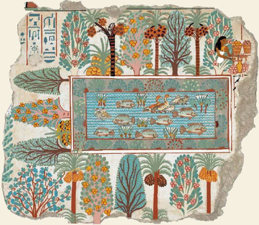 Cette fresque provient d’un tombeau de Thèbes et représente un jardin dans lequel se trouve un bassin avec des poissons. Les différentes variétés d’arbres sont juxtaposées verticalement ou horizontalement. Le bassin est ajouté au centre. Un enfant pourrait utiliser cette méthode pour représenter tout ce qu’il voit sur une même feuille de papier.