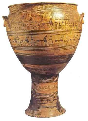 Vase du Dipylon (8e siècle av J.-C.) Hauteur, 108 cm, Metropolitan Museum of Art, New York Découvert dans le cimetière du Dipylon, à Athènes, ce vase de grande dimension est une urne funéraire qui contenait des offrandes faites au défunt. Les motifs géométriques subsistent, mais deux frises représentent un cortège funèbre. Par contre, aucune évocation de l'au-delà, contrairement à la peinture égyptienne.