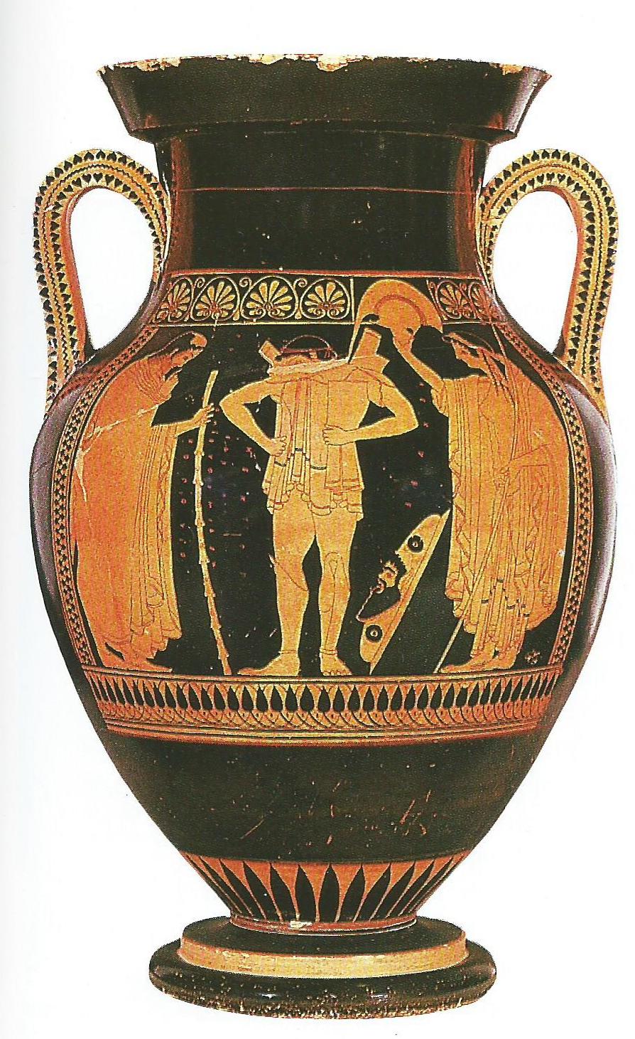 Le départ du guerrier (v. 510-500 avant J.-C.) Hauteur 60 cm, signé par Euthymidès, Staatliche Antikensammlungen und Glyptithek, Munich A la fin du 6e siècle apparaissent les vases à figures rouges qui vont ensuite devenir la norme. Un guerrier se prépare à partir pour la guerre et revêt son armure. Les personnes qui assistent le guerrier sont représentées de profil, mais le guerrier lui même est de face. Son pied droit est de profil, mais le gauche est de face. Il est alors nécessaire d'utiliser la technique du raccourci pour se rapprocher de ce que capte l'œil humain.