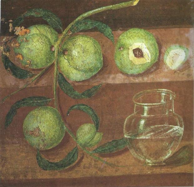 Pêches et carafe d'eau, Herculanum (v. 50 avant J.-C.) Peinture murale, Musée archéologique national, Naples Au premier abord, on pourrait se croire en présence d'une nature morte post-Renaissance. Le rendu de l'eau dans la cruche est remarquable. Mais il manque un traitement satisfaisant de la lumière. D'où vient-elle ? Il n'est pas possible de le dire. Le talent du peintre donne malgré tout à l'ensemble une vérité saisissante.