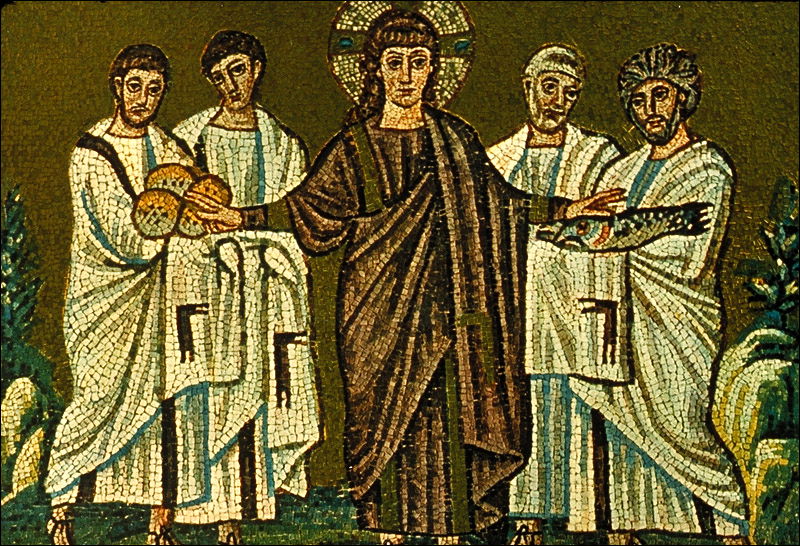 La multiplication des pains et des poissons (v. 520) Mosaïque, Basilique San Apollinare Nuovo, Ravenne Les basiliques de style byzantin comportent des mosaïques représentant l’empereur ou des scènes religieuses. Ici, Jésus-Christ accomplit le miracle de la multiplication des pains et des poissons. Il parvient ainsi à nourrir plusieurs milliers de personnes. A cette époque, Le Christ est un jeune homme sans barbe et aux cheveux longs.