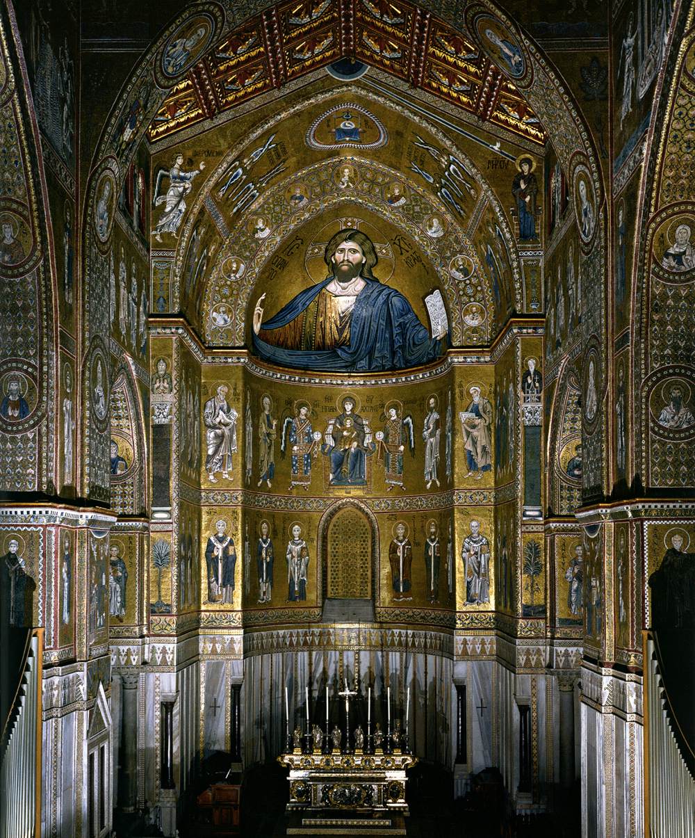 Le Christ Pantocrator (v. 1180) Mosaïque, cathédrale de Monreale, Sicile Le mot latin pantocrator signifie maître de tout, tout puissant. Cette représentation majestueuse du Christ est courante dans l’art byzantin et s’oppose à celle du Christ souffrant, privilégié par l’art occidental. Dans sa main gauche, le Christ tient une page de l’Évangile selon saint Jean qui indique : « Je suis la lumière du monde. Celui qui me suit ne marchera pas dans les ténèbres. » La cathédrale de Monreale a été fondée par le roi normand William de Sicile (1154-1189) en 1174. Elle témoigne de l’influence considérable et durable de l’art byzantin au-delà des frontières de l’Empire d’Orient.